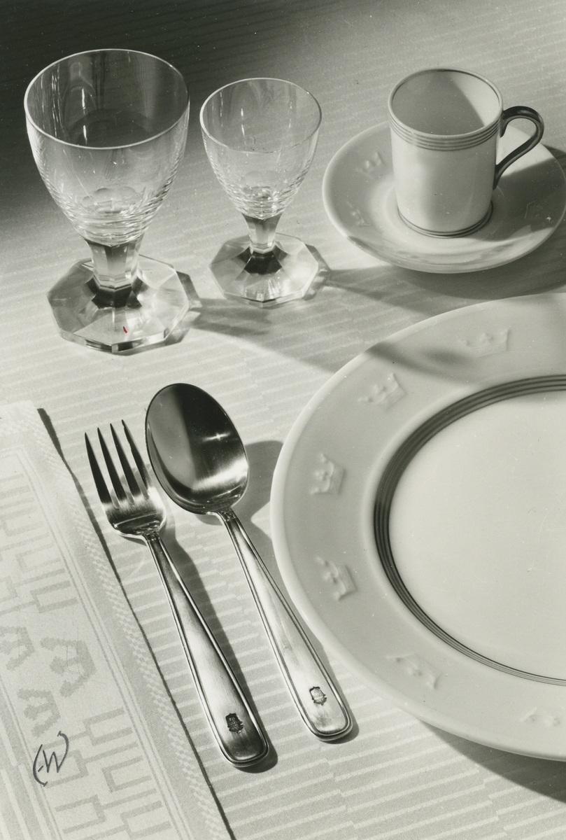 Detaljbild av dukning, Ambassadservisen med krondekor från Gustavsbergs Fabriker.