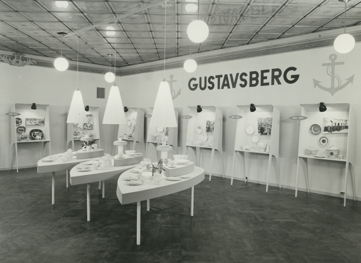 Utställning av hushållsporslin och stengodspjäser från Gustavsbergs Fabriker. Okänd plats.