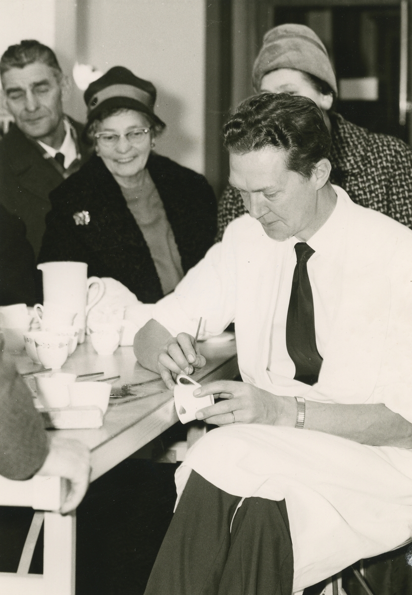 Dekorering av serviskopp Blå Blom. Förevisning. Okänd plats.