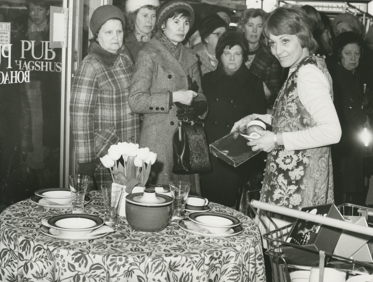 PUB Bohagshus. Utställning av hushållsporslin från Gustavsbergs Fabriker. Inbjuden gäst: Siw Malmkvist.