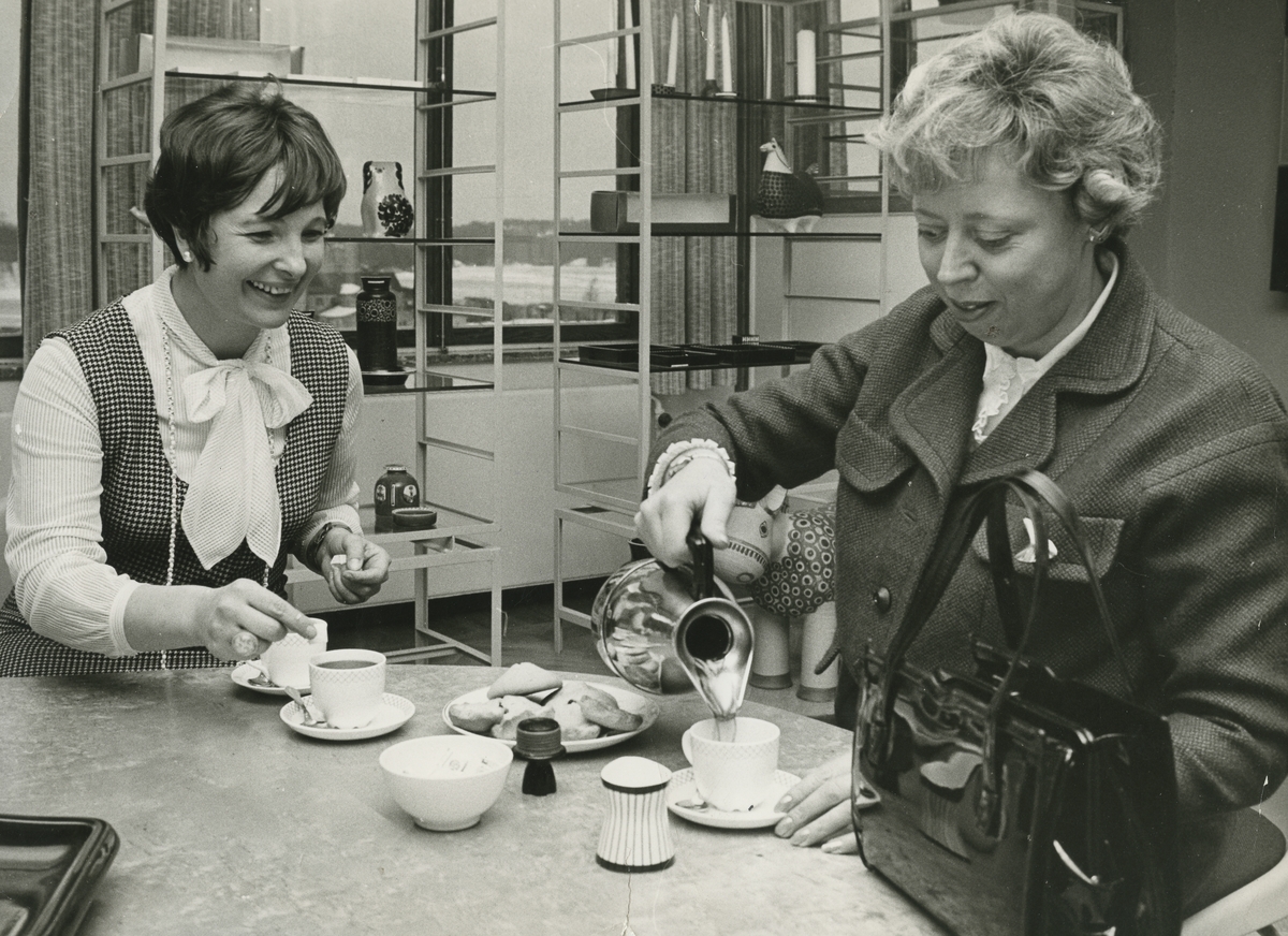 Interiörbild. Kaffestund, sannolikt på Gustavsbergs Fabriker. Besök av Mari Louis Tamm.
