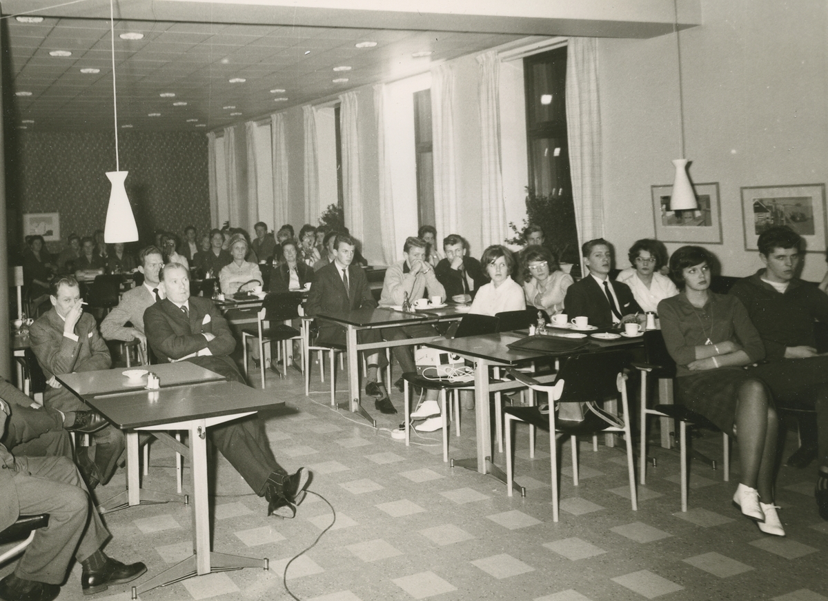 Interiörbild. Sannolikt ett föredrag på Folkets Hus arrangerat av Konsum i Sundsvall.<br>