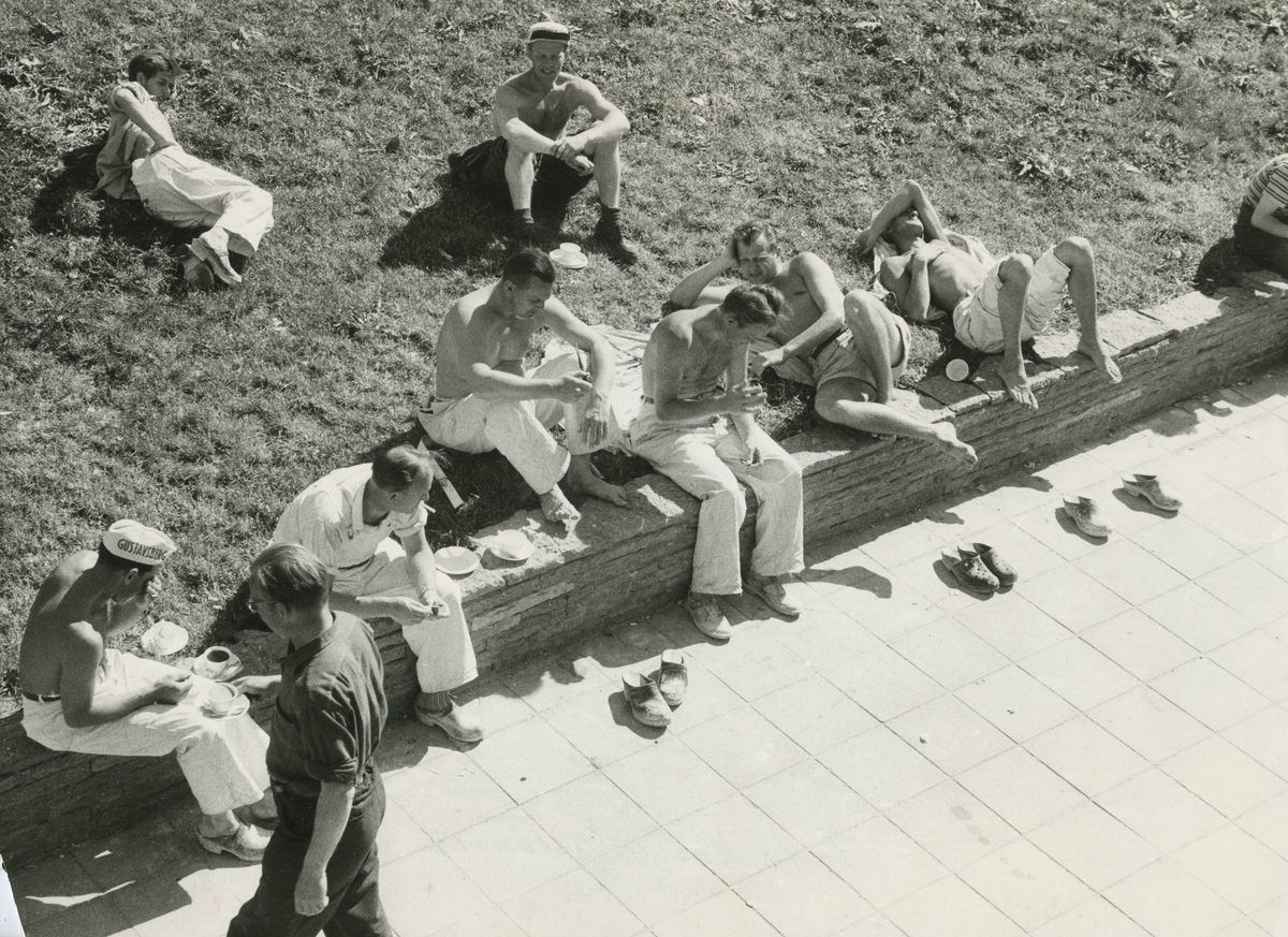 Titel: Exteriörbild, Gustavsbergs Fabriker. Rast för fabriksarbetare.<br> Personer: Okända fabriksarbetare.
