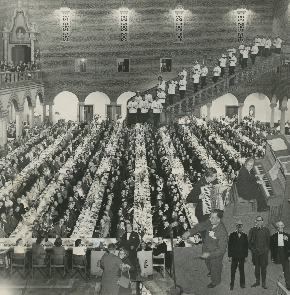 Interiörbild. Fotocollage. Personalfest i Stockholms Stadshus, Blå Hallen 1/9, 1949 med anledning av KF:s 50-årsjubileum.