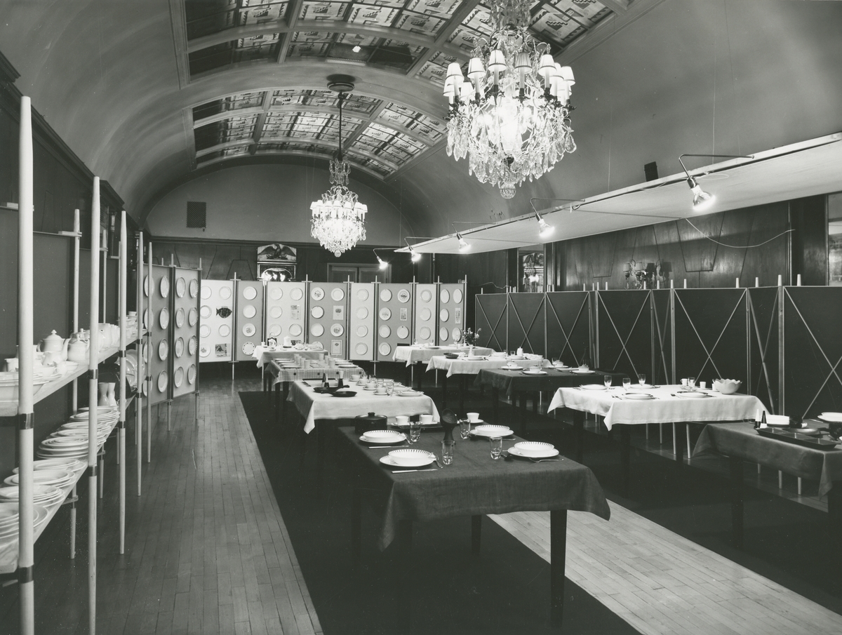 Interiörbild. Utställning av hushållsporslin från Gustavsbergs Fabriker 1956. Okänd plats, sannolikt i Göteborg.