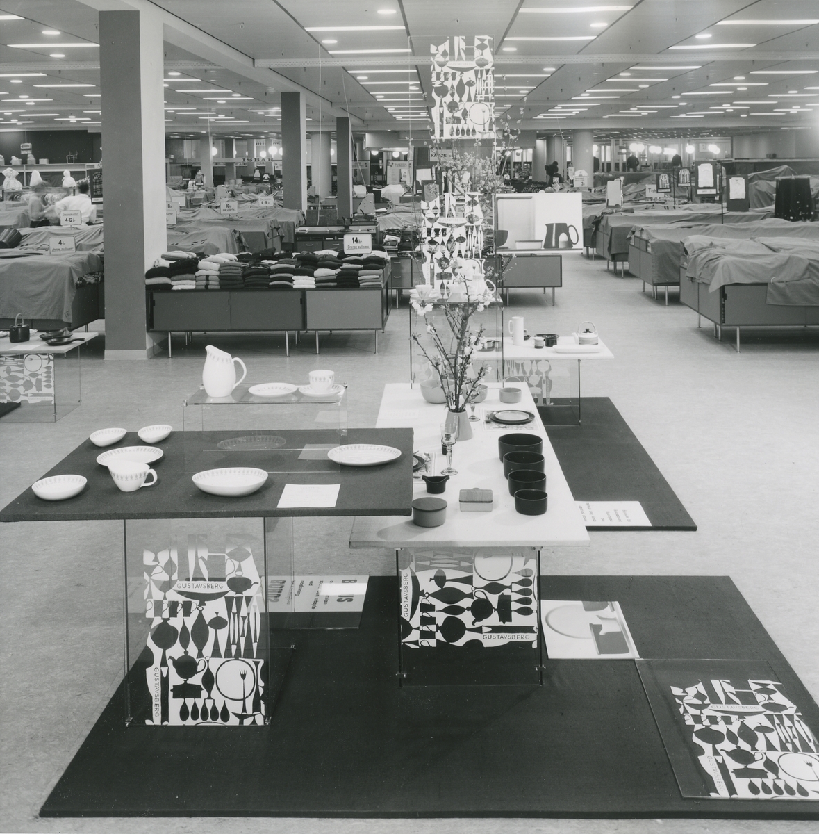 Interiörbild. Utställning av hushållsporslin och prydnadsföremål från Gustavsbergs Fabriker i Köpenhamn. Okänd plats.