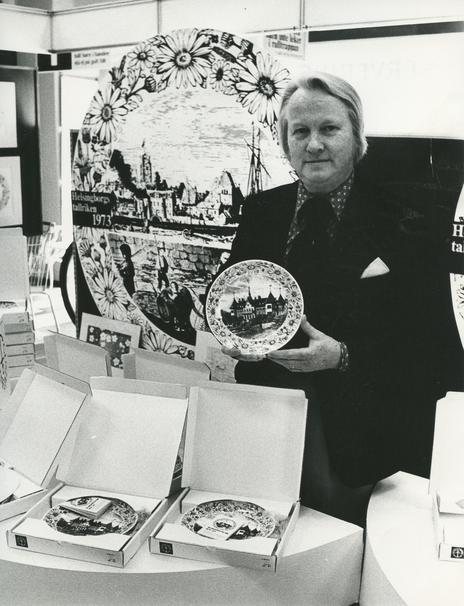 Interiörbild. Sven Jonson visar en av sina dekormålade samlartallrikar tillverkade i Gustavsbergs Fabriker. Okänd plats, Sannolikt i Helsingborg.