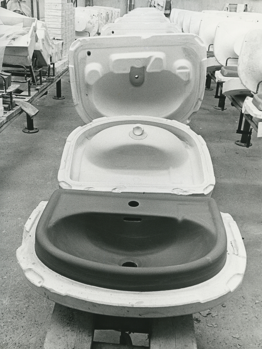 Interiörbild. Gustavsbergs Fabriker, Sanitetsporslinsfabriken. Gipsform för tvättställ gjutet och färdigt för urtagning ur den tvådelade formen.