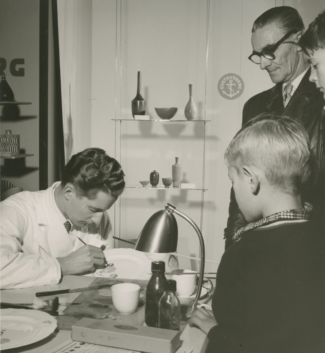 Interiörbild. Förevisning av dekormålning på porslin. Dekormålare: Åke Sörling.