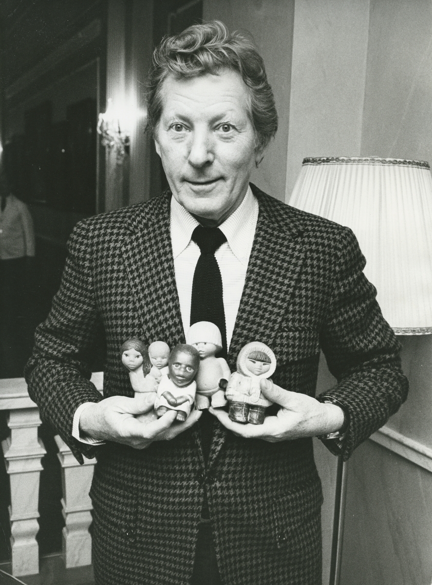 Titel: Porträttbild av Danny Kaye 1974 med små stengodsfigurer ur serien All världens barn formgivna för UNICEF av Lisa Larson. <br> Personer: Danny Kaye