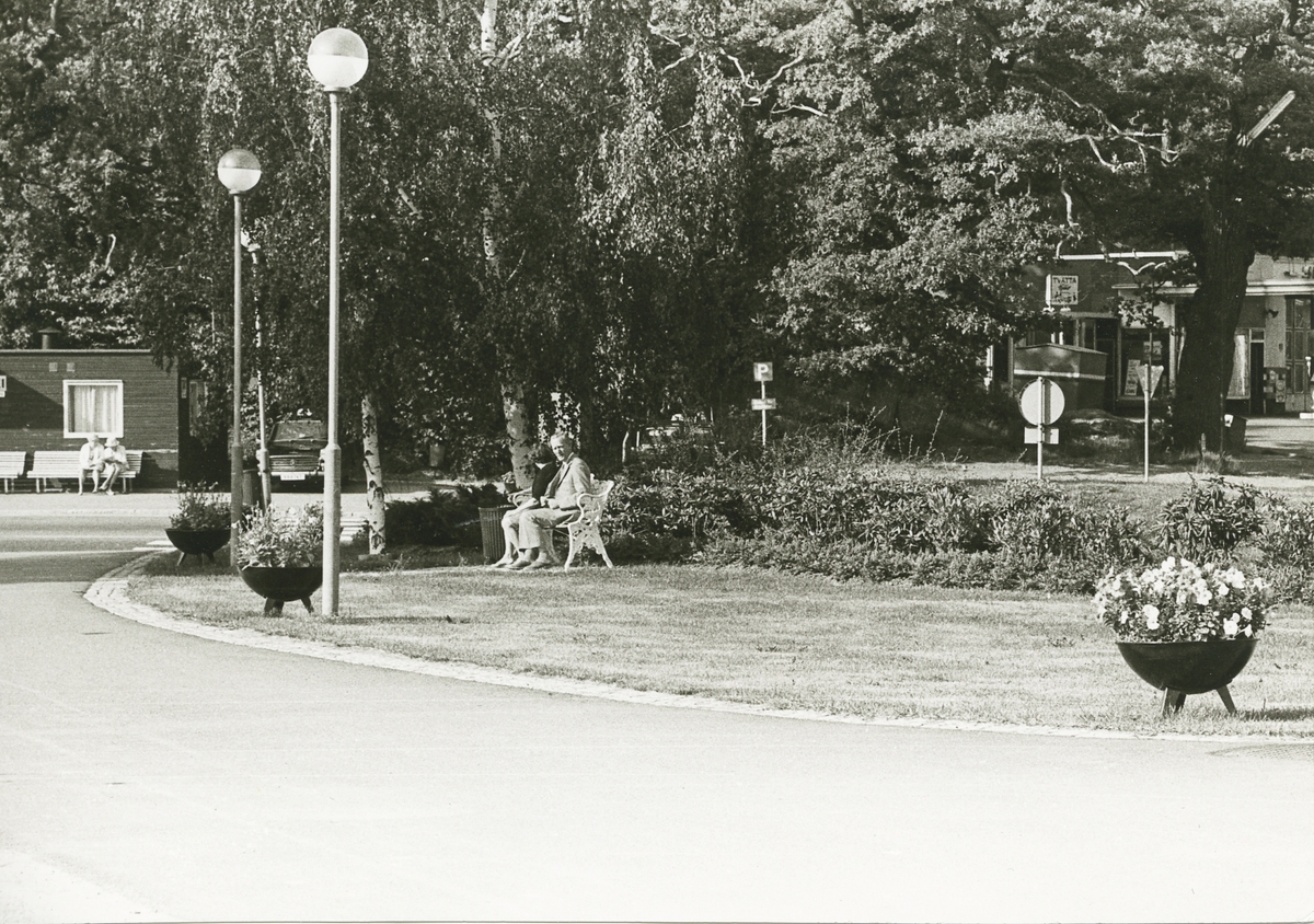 Gustavsbergs centrum innan den nya centrumanläggningen byggts. <br>Gamla taxistationen och den äldre OK-stationen.