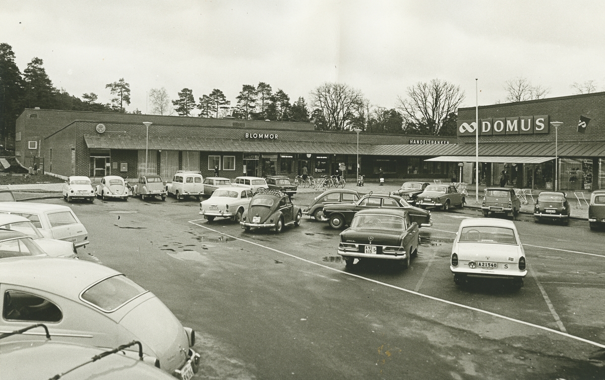 Exteriörbild. Vy över del av Gustavsbergs nya centrum. Parkeringsplatsen utanför Domus.