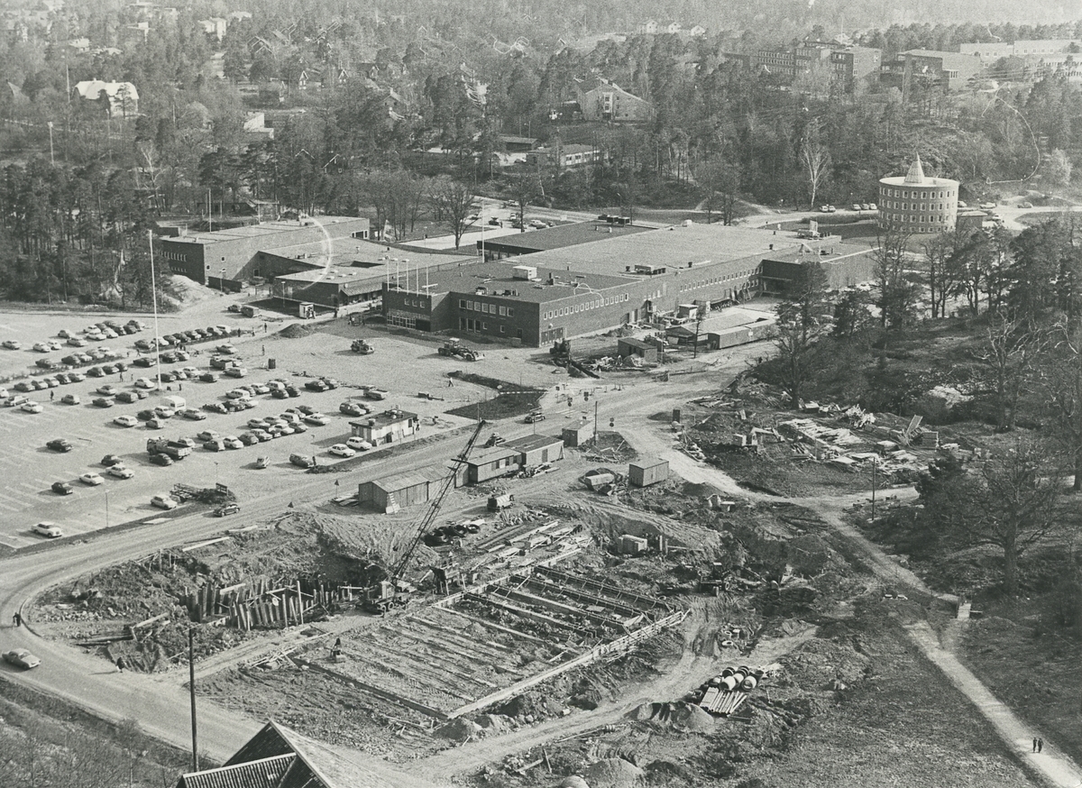 Exteriörbild. Vy över del av Gustavsbergs nya centrum. Parkeringsplatsen. Det nya OK byggs.