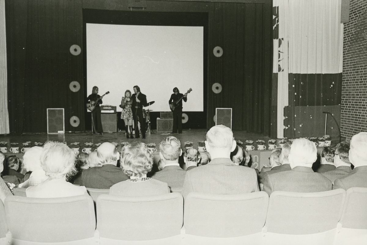 Titel: Interiörbild. Scenframträdande och publik på Gustavsbergsteatern, Gustavsbergs nya centrum. Personer: Okända personer.