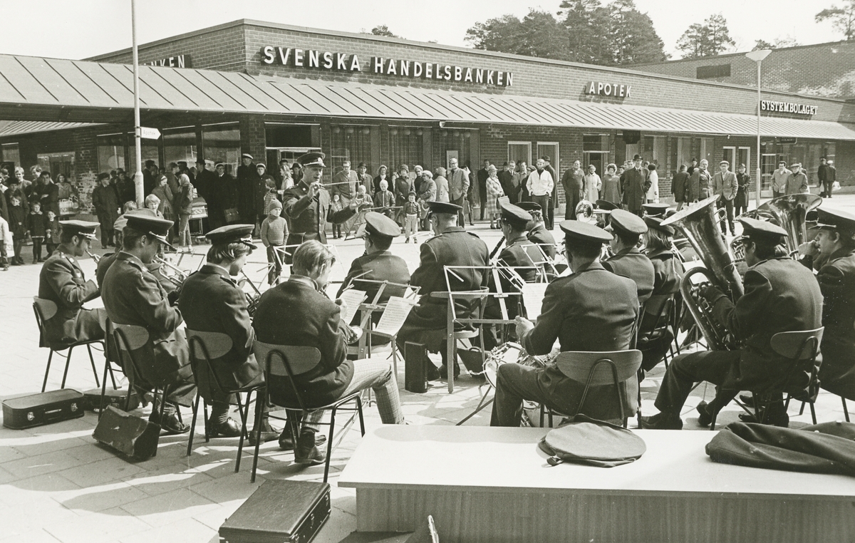 Exteriörbild.Musikunderhållning av orkester i samband med invigningen den 24 april 1964.av det nybyggda Domus, Gustavsbergs centrum.