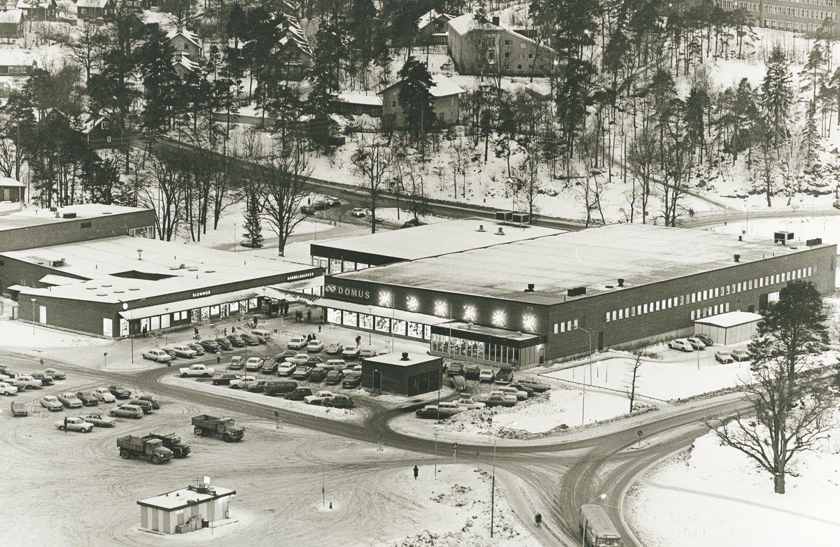 Exteriörbild. Vintertid vid Domus, Gustavsbergs centrum. I bakgrunden bostadshuset Skuggan (nu rivet) och Mariagatan 13.