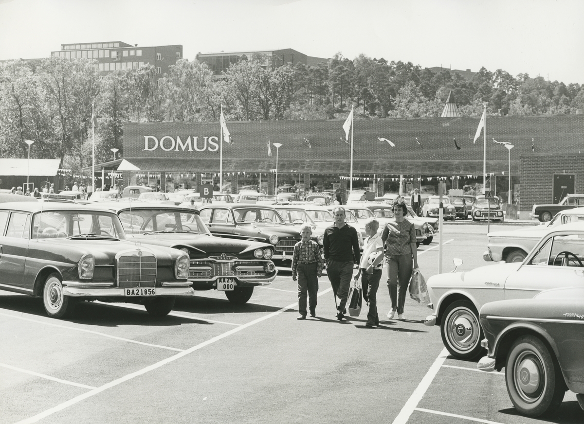 Exteriörbild. Familj vid bilparkering utanför Domus, Gustavsbergs centrum.