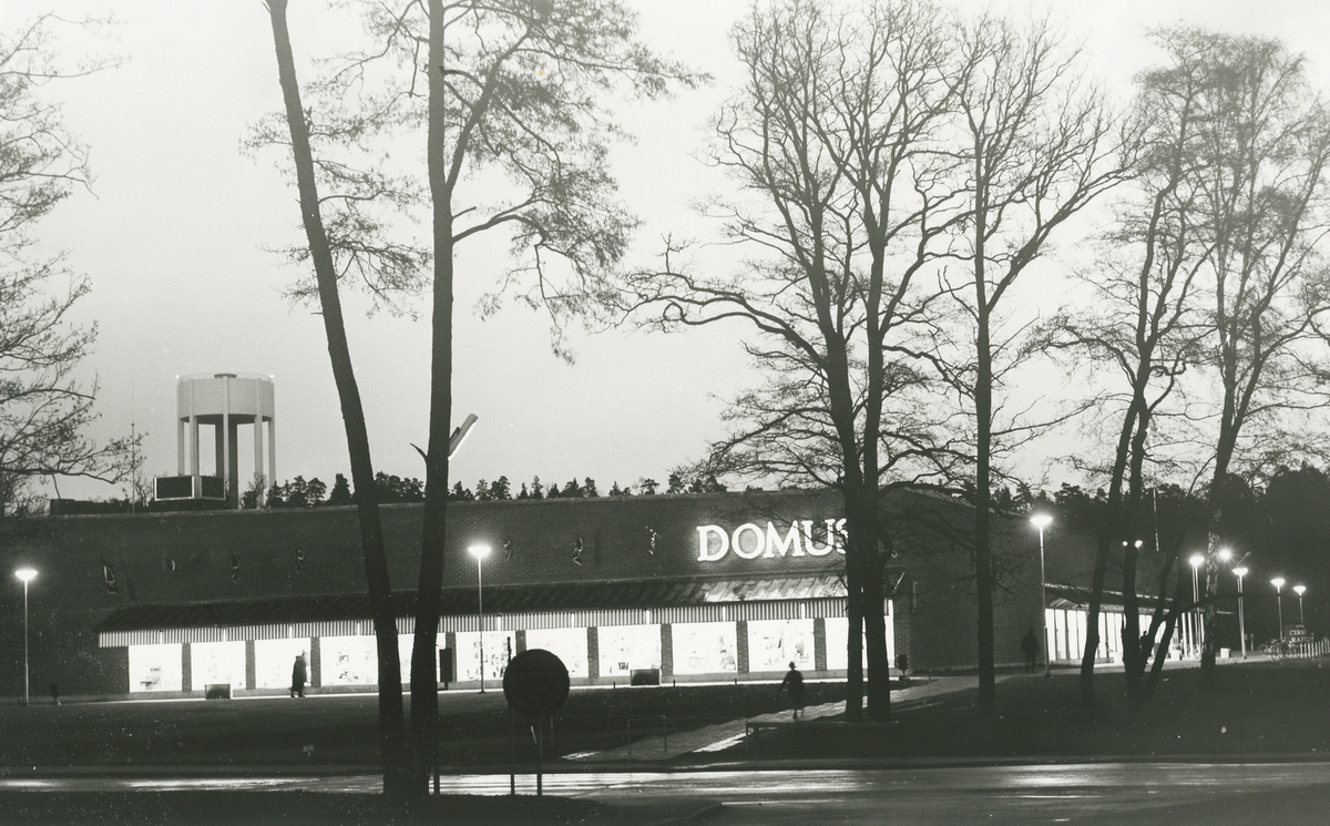 Exteriörbild. Domus i kvällsljus, Gustavsbergs centrum.