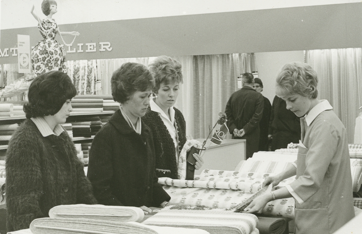 Interiörbild. Domus varuhus. Uppmätning av tyg på sybehörsavdelningen, Gustavsbergs centrum.