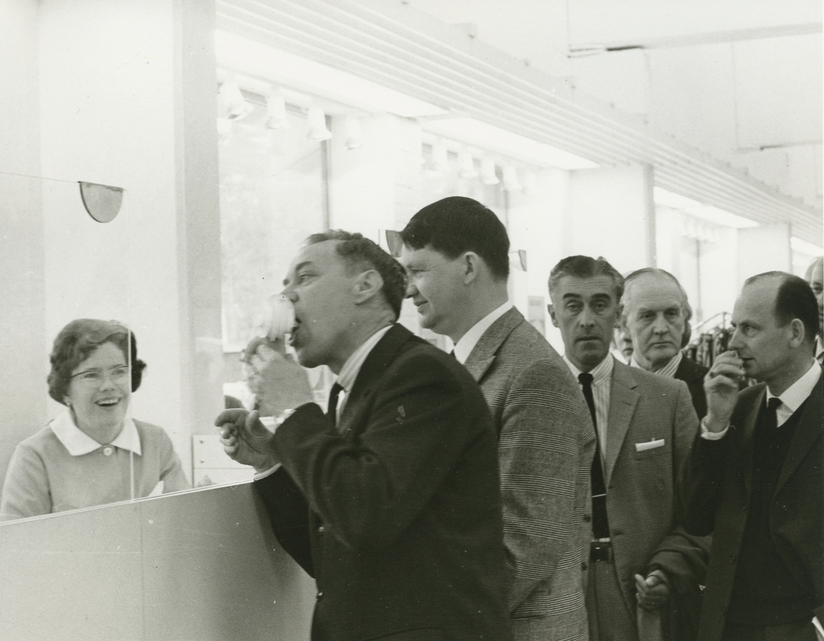 Interiörbild. Domus varuhus, glassförsäljning. Gustavsbergs centrum. <br>Ruben Edqvist nummer 2 i kön<br><br>