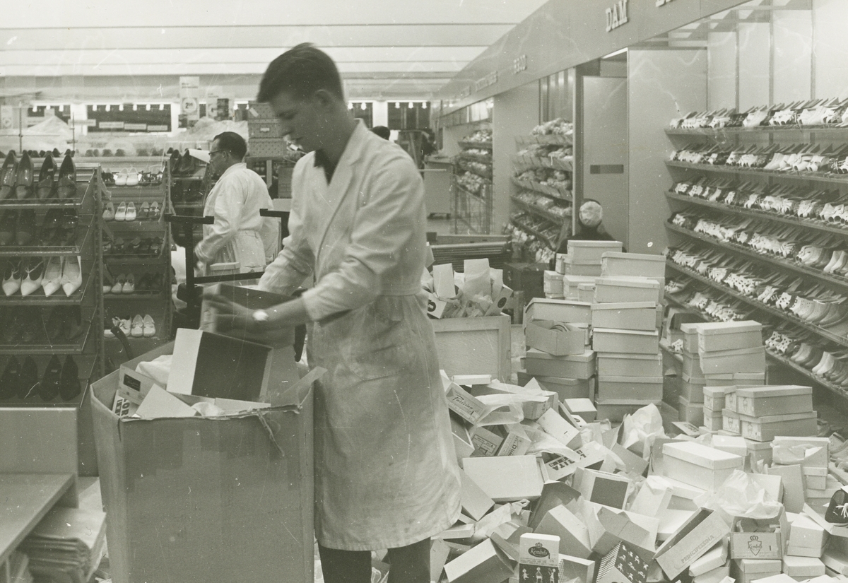 Interiörbild. Domus varuhus. Biträden, skoavdelningen, Gustavsbergs centrum.
