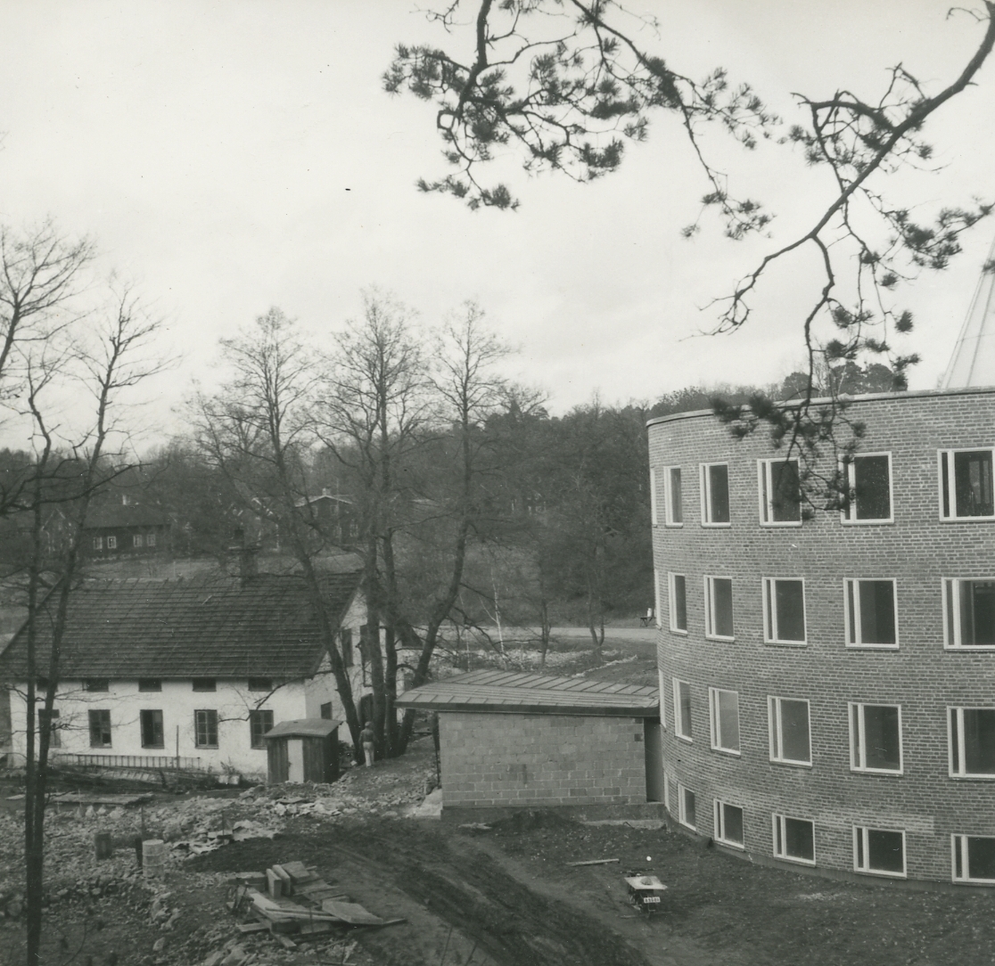 Exteriörbild. Kommunalhuset, Runda huset. med tvättstugan i bakgrunden.