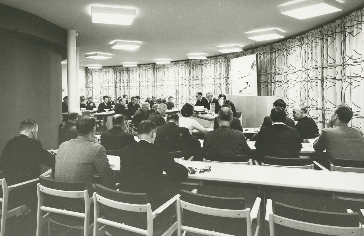 Interiörbild. Kommunalhuset, Runda huset. Sannolikt nämndmöte.