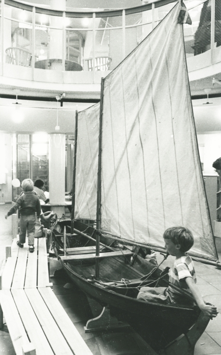 Interiörbild. Runda huset, biblioteket. Singösnipan Elvira, fantasins seglande båt..