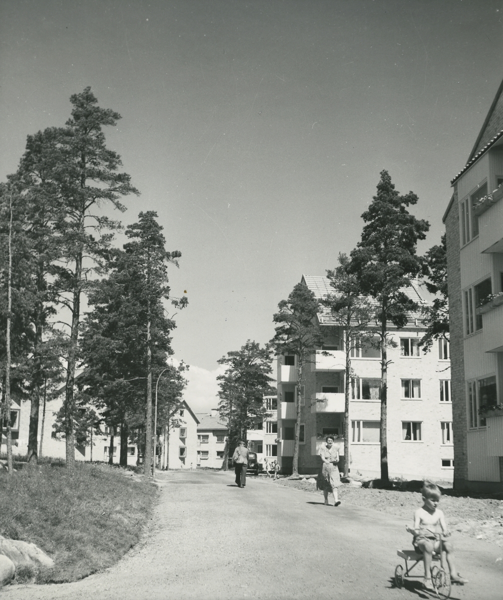Exteriörbild. Hästhagen innan asfalteringen. Trevåningshus med två och trerumslägenheter.