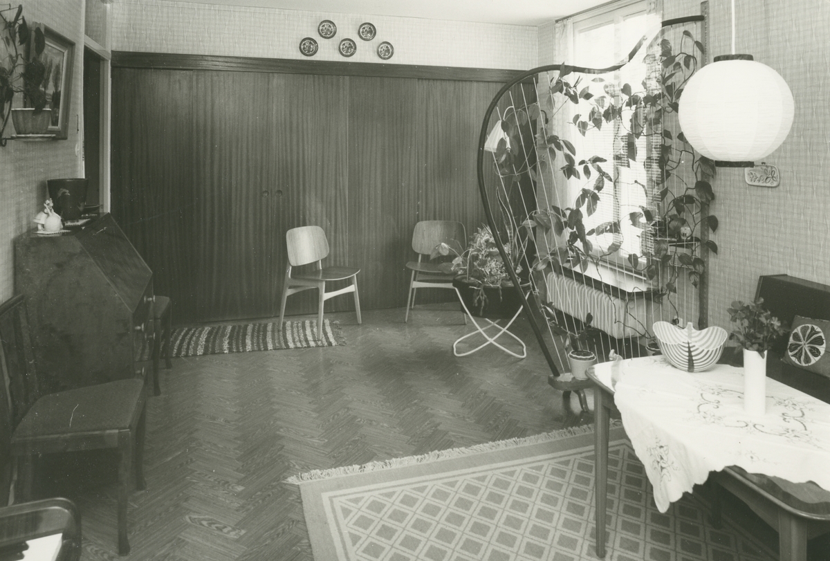 Interiör. Vardagsrum med skjutdörrar till köket. Hästhagen.