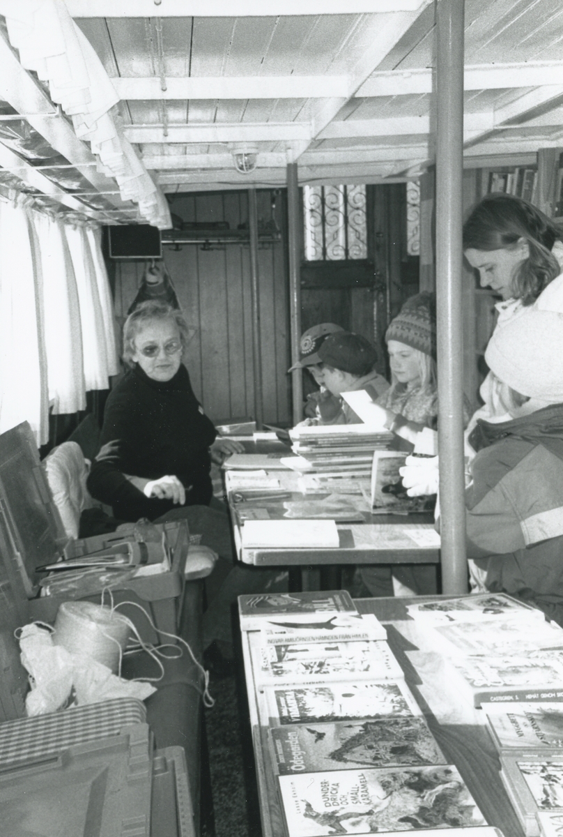 Interiör. Bokbåten Gurli. Bibliotekarie och låntagare.