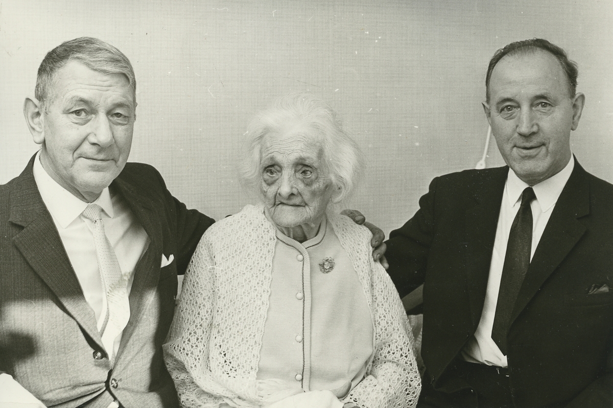 Gustavsgården. Anna Stein tillsammans med två gratulanter firas på sin hundraårsdag den 14 januari 1967.