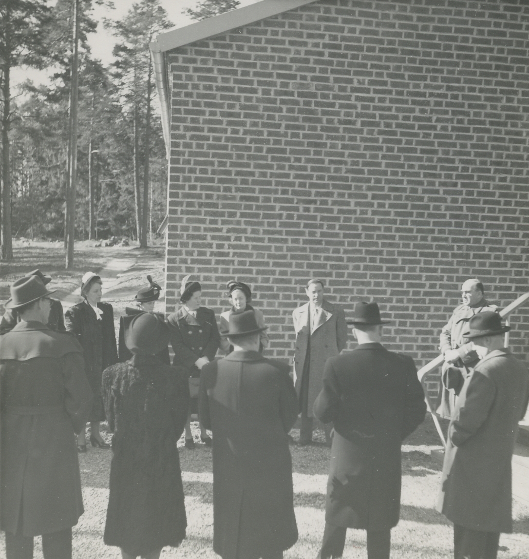 Exteriörbild. Invigning av Landstingets förlossningshem, mars 1949, beläget invid Skogsbo, Adress: <br>Är idag Hälsans Hus.