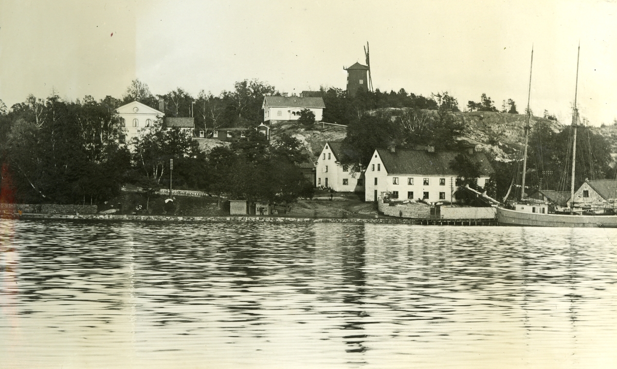 Vy från väster mot Kvarnberget med Väderkvarnen, Stjärnan och Värdshuset i bakgrunden och Stenhusen i förgrunden.