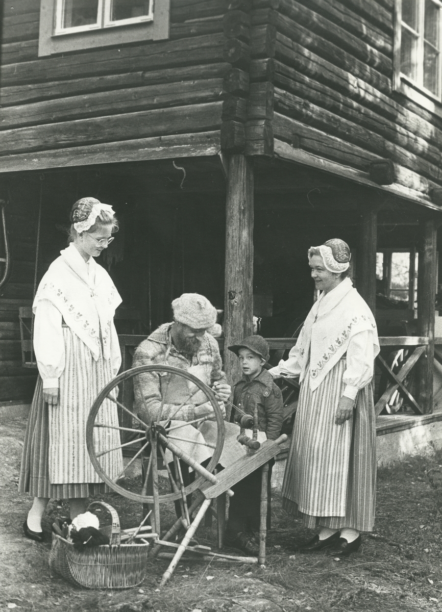 Titel: Exteriör. Strömma Museum. Personer i tidstypiska kläder visar hur man spinner ull, en vanlig syssla förr. Personer: okända