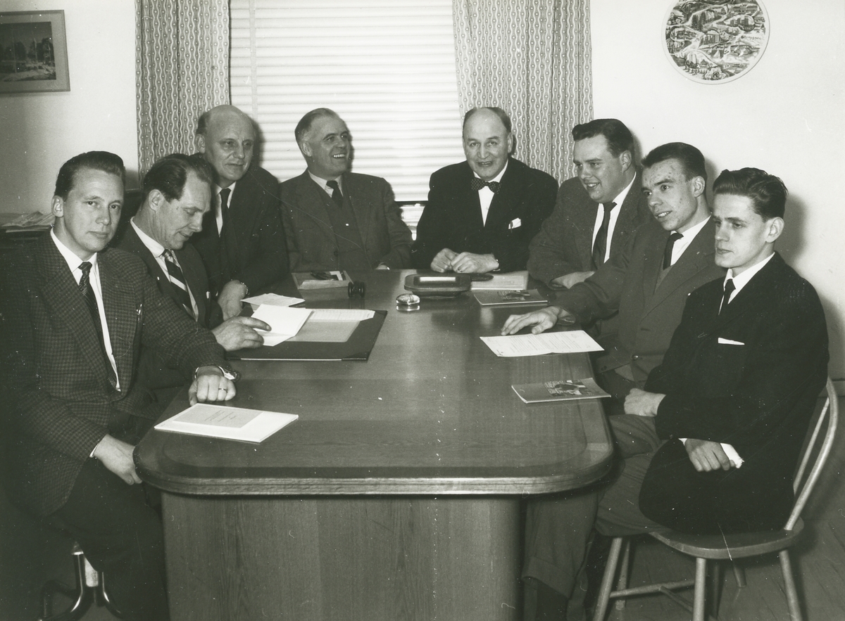 Titel: Interiörbild. Medlemmar i Konsumstyrelen. Personer: Fr. v. Henry Ericson, Lars-Olof Lindahl. Gunnar Mattsson, Harry Pettersson , Erik Nilsson, okänd, okänd, Gunnar Waern