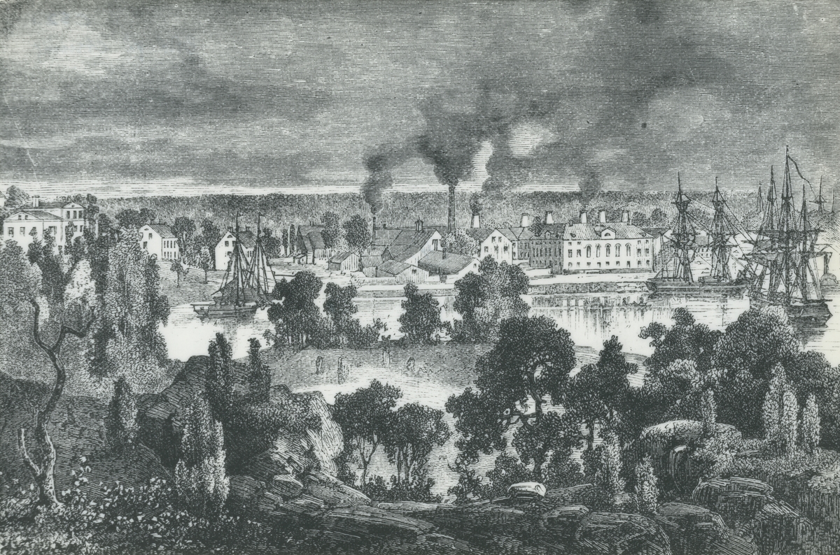 Extgeriör.Gustafsbergs Porcellinsbruk. Sannolikt 1840-tal. Fotograferad etsning.