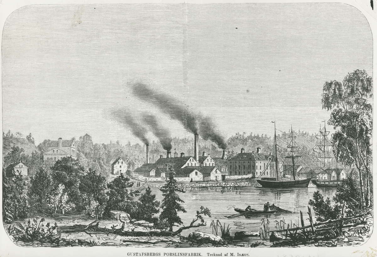 Exteriör. Gustavsbergs Fabriker. Fotograferad teckning av M. Isaeus.<br>1870-tal.