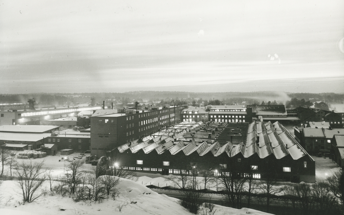 Exteriör. Vinterrvy över Gustavsbergs fabriksområde. Utsikt från Kvarnberget.