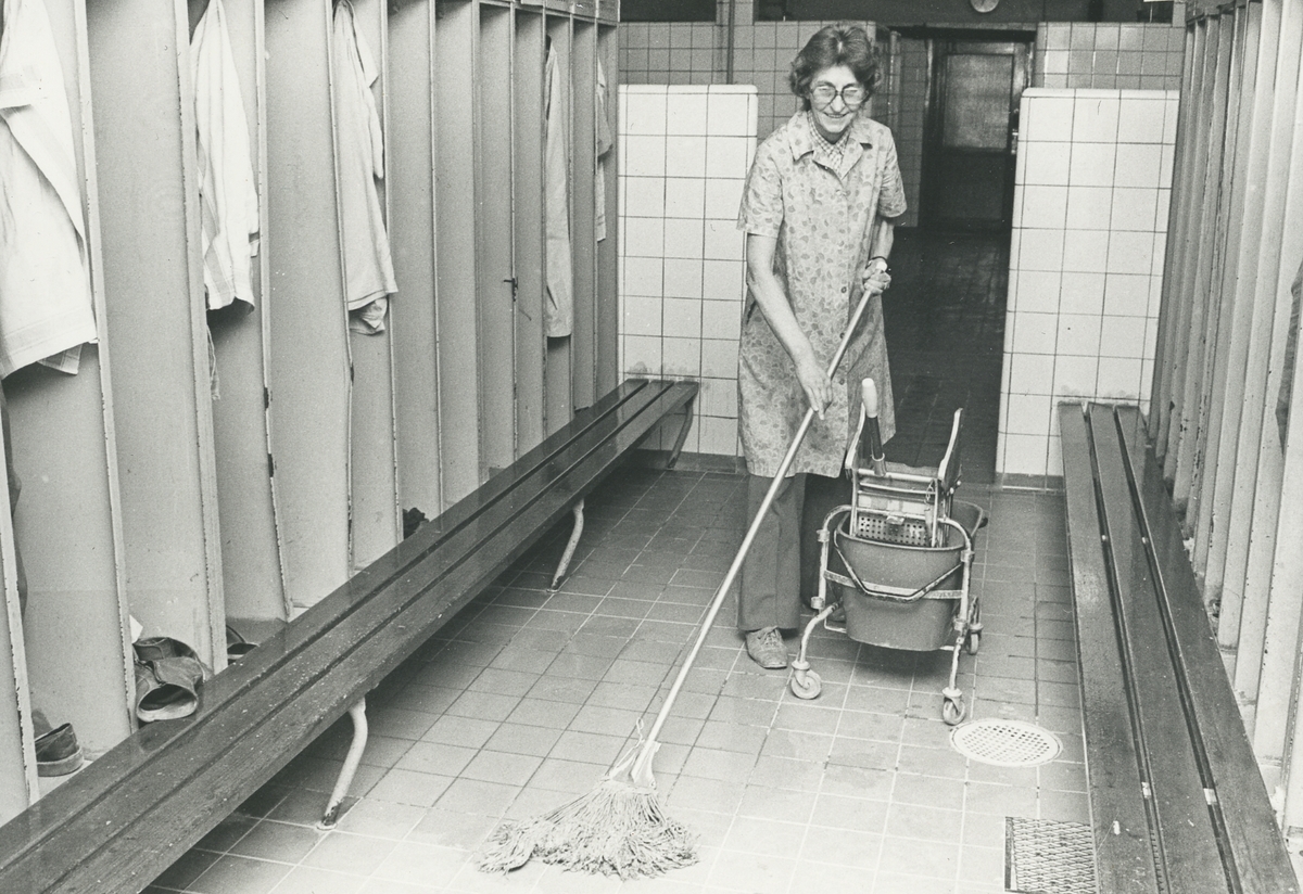 Interiör. Städerska i omklädningsrum, Hushållsporslinsfabriken.