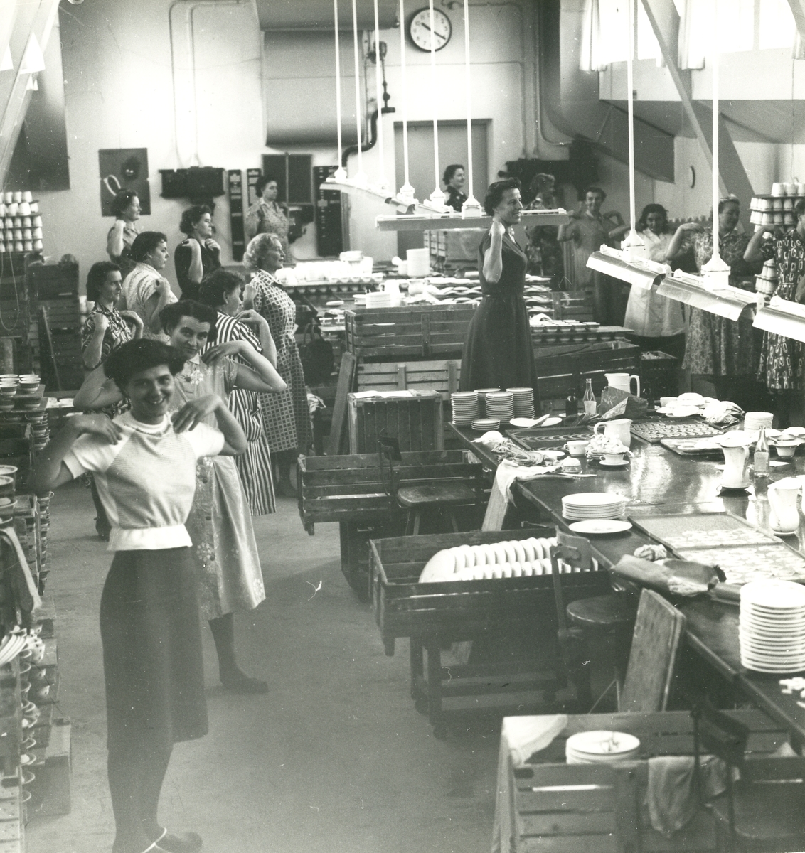 Interiör. Företagsgymnastik på arbetstid. Ledare i mitten: Svea Box.
