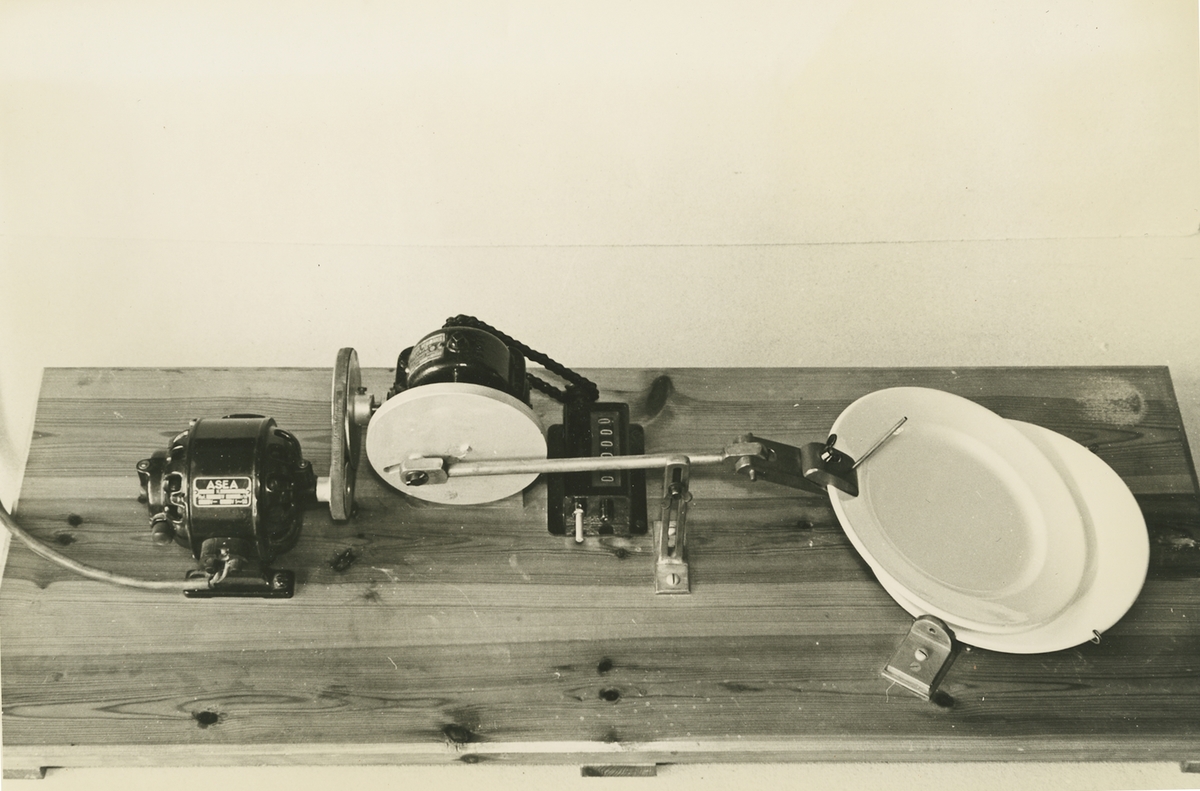 Interiör, Materiallaboratoriet. Apparat för provning av hållfasthet för benporslin vid stapling.