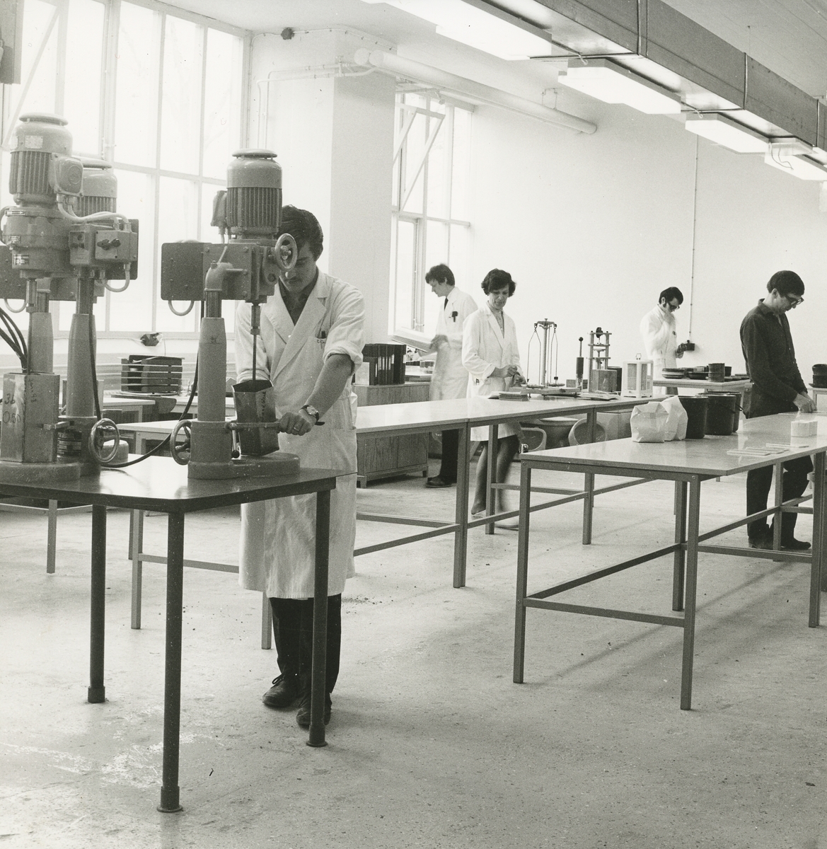 Interiör. Materiallaboratoriet. Utförande av materaltester.