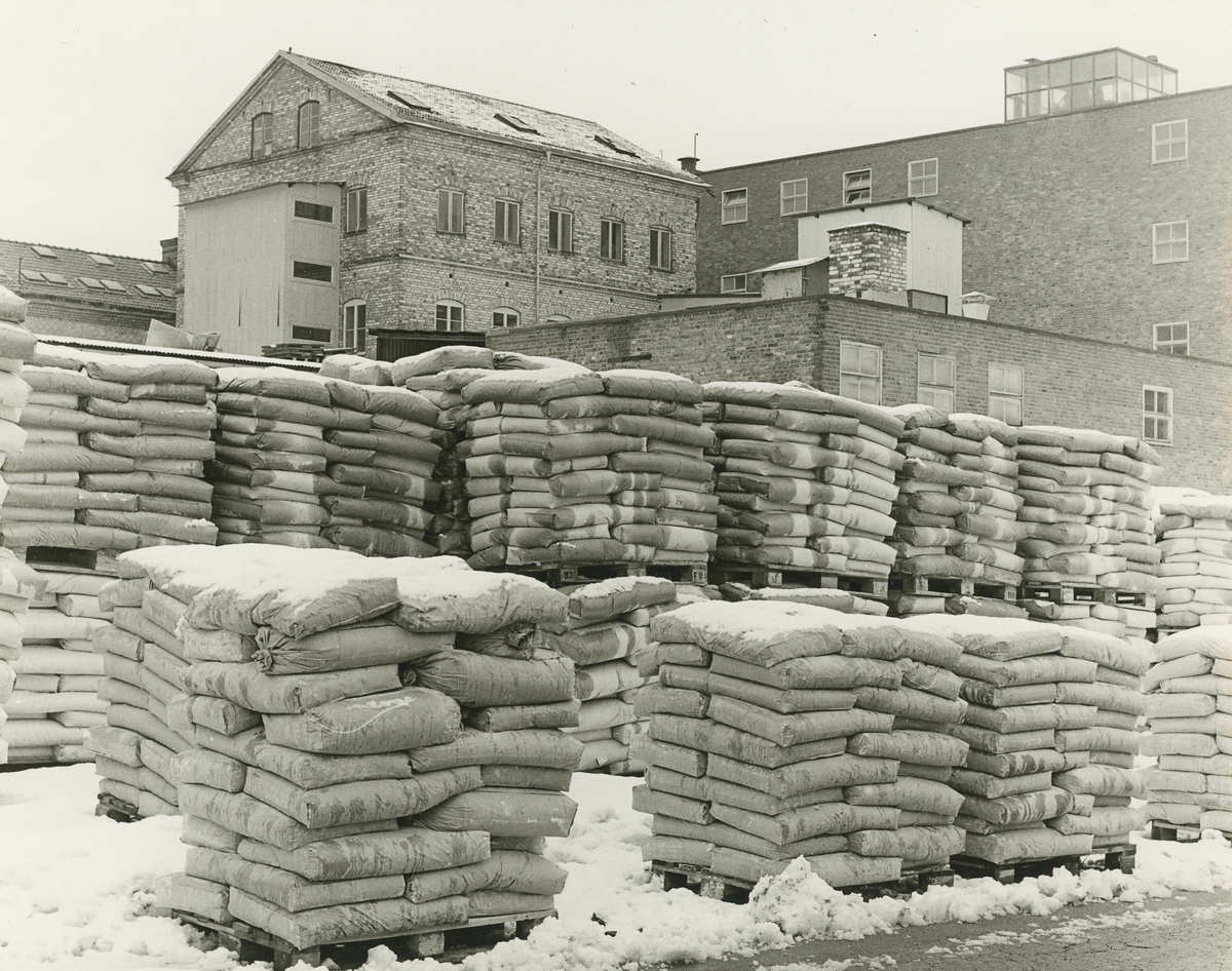 Exteriör. Lastutrymme för in och utförsel av gods och råmaterial tillhörande Hushållsporslinsfabriken. Säckar med okänd produkt.