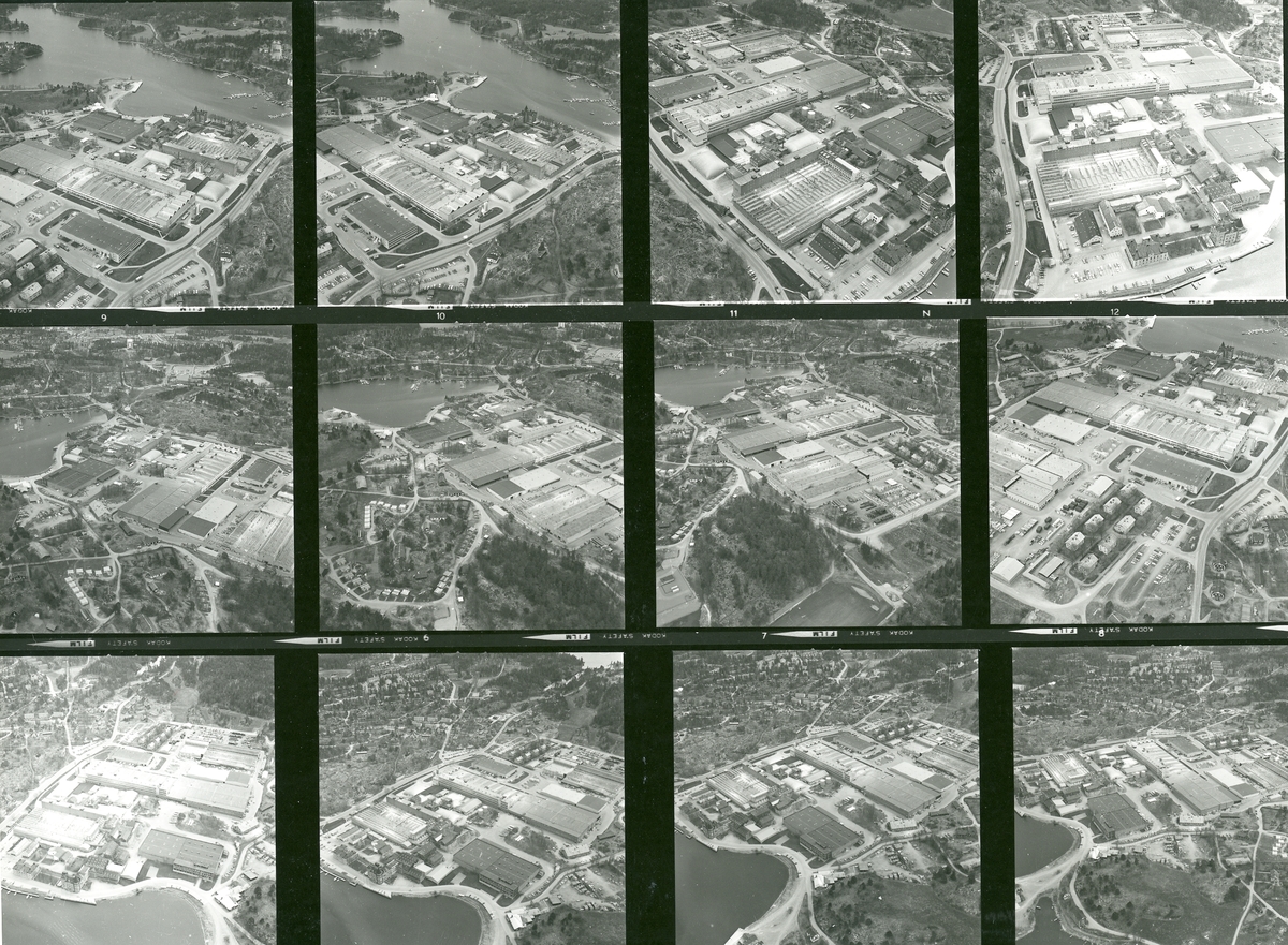 Exteriör. Flygfoton över Gustavsbergs fabriksområde med omnejd och del av Farstaviken.