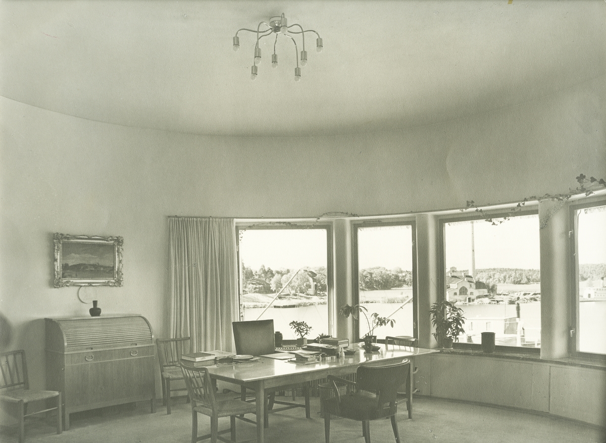 Interiör, Huvudkontoret. Arbetsrum för Gustavsbergs Fabrikers VD Hjalmar Olson med utsikt över Farstaviken.