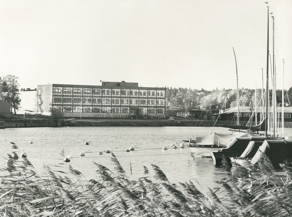 Exteriör. Tekniskt center eller i folkmun kallat Glashuset, byggt 1971. <br>I förgrunden Farstaviken.<br>