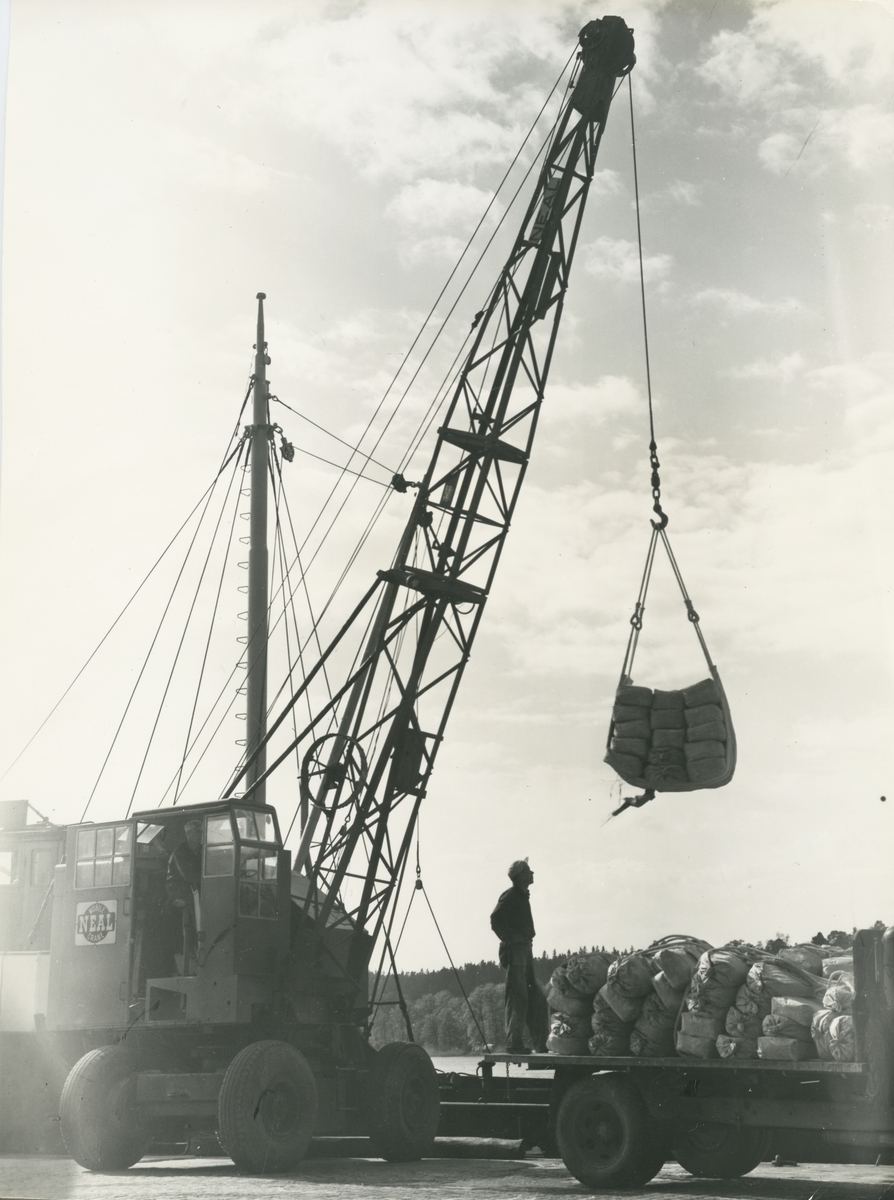 Exteriör. Lossning. Lyftkran med okänd last. Farstaviken.