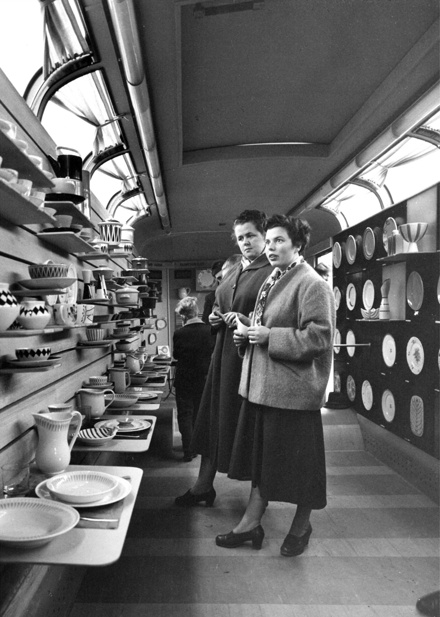 "Porslinsbussen" från Gustavsberg parkerad utan för Folkets Hus i Ljungaverk, Ånge kommun. Två damer studerar utbudet.