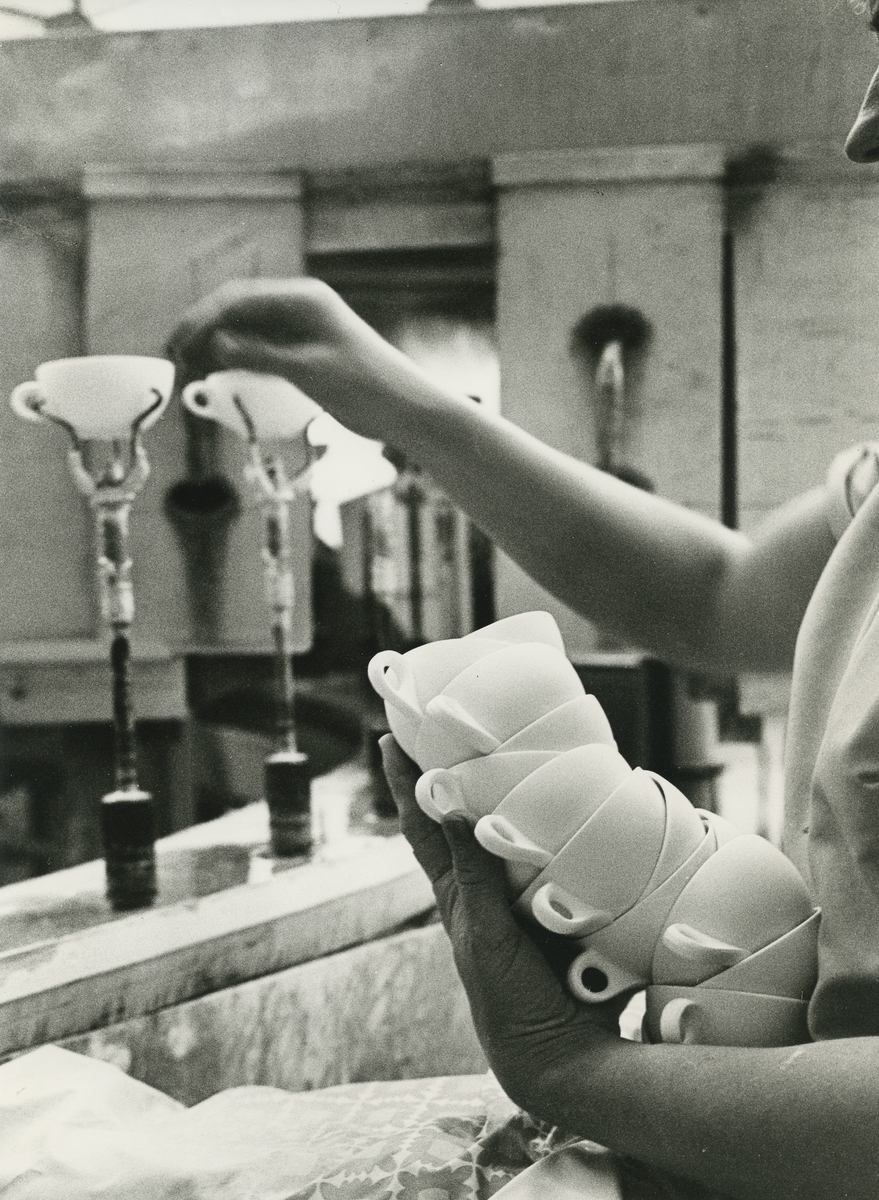 Detaljbild, Hushållsporslinsfabriken. Avplockning av gods från glasyrkarusell.